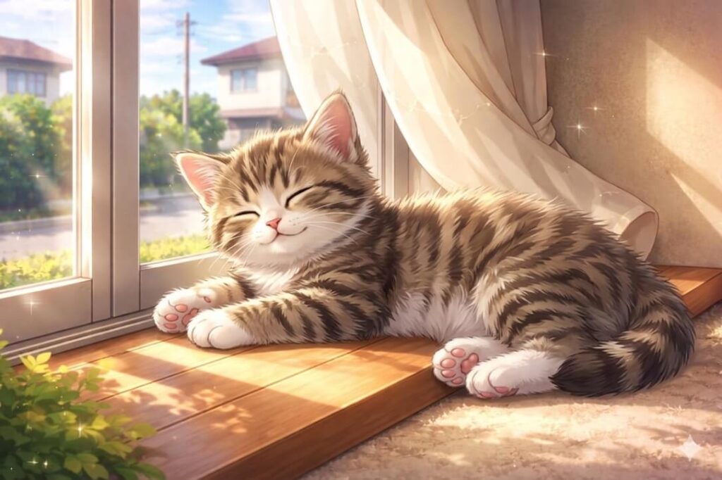 これが増えると猫はリラックスしやすくなって、ストレスもやわらぐんやで。さらに夜になると、そのセロトニンが睡眠ホルモンのメラトニンに変わるから、睡眠の質も自然と上がるんや。