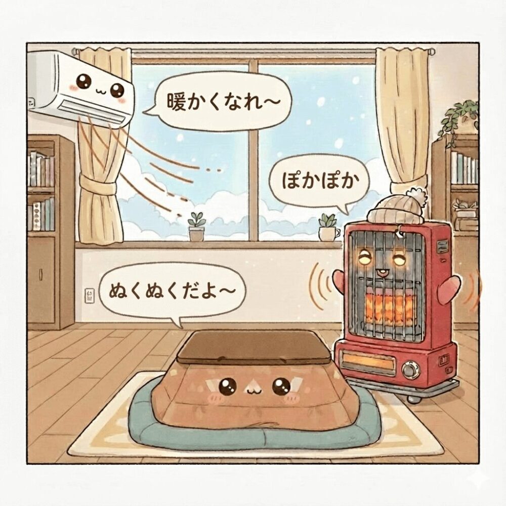 こたつ:◎ 体感温度が高く、しっかり暖かい